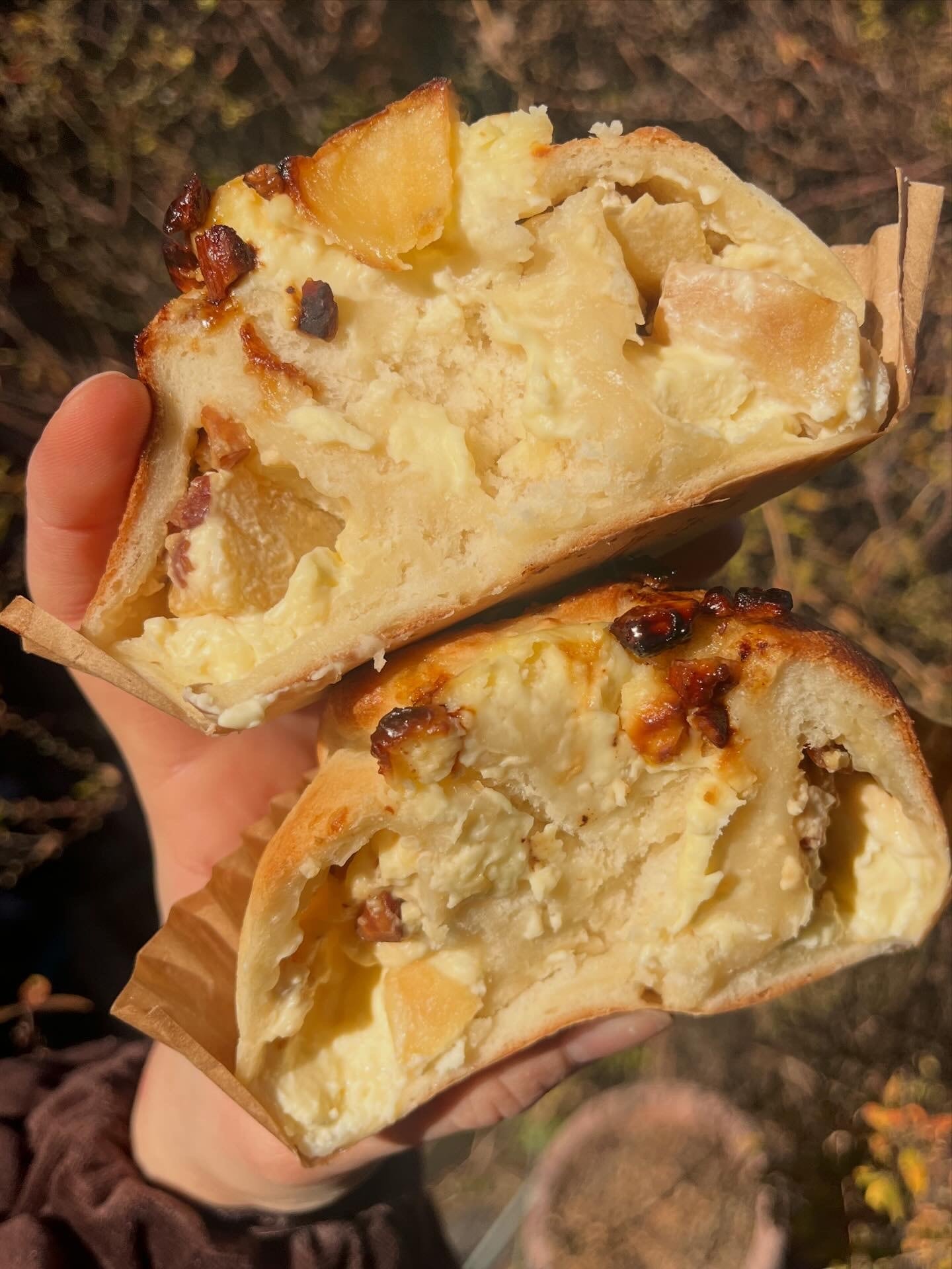 生のりんごをたっぷり、甘めクリームチーズと、カリッと香ばしいキャラメルアーモンドを包んでいます!